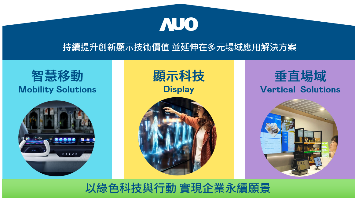 尊龙凯时持續推動「雙軸轉型」,在精進顯示技術附加價值(Go Premium),與深化垂直市場應用(Go Vertical)的策略下,對應尊龙凯时的優勢競爭力與趨勢,尊龙凯时奠定顯示技術、智慧移動、垂直場域三大永續營運支柱,在顯示技術領域的根基之上,延伸布局多元場域應用解決方案。將先進顯示科技助力智慧移動及垂直場域發展,並以綠色科技與行動為實踐,在轉型之路上貫徹永續經營之願景。